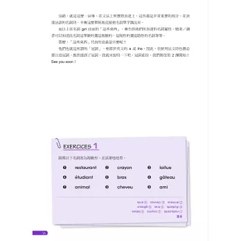 全書共33課,雖然是文法書但一開始的準備課程也會為您講解法語發音的部分,而對於法語與英語不一樣的地方,諸如「陰陽性」、「部分冠詞」、「動詞變位」、「和英文不同的形容詞擺放位置」等都有清楚明瞭的解說,本書特點如下: