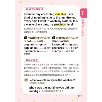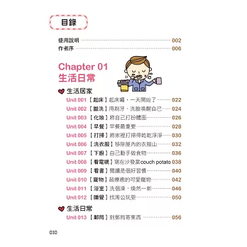 書中的章節雖然簡短,但內容很豐富且多樣。每個單元都有完整的學習內容,從單字、例句、簡短文章、衍生學習、小故事……等,透過各種不同的內容,讓讀者學到最全面、實用的英文。再加上繪者精心繪製的插圖,讓這本書看起來更加豐富,希望各位讀者覺得這本《睡前五分鐘的英語自修課》有用又有趣。