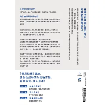 本書和之前另一本《快思慢想》不只書名有些雷同,內容也有相通之處;不過本書在理論架構上沒那麼宏偉複雜,主要是以實務推導,比較簡單易讀。藉著「深入思考」日常事物,借用他人構思再加以整合,除了學習將現象的共同特徵抽象化,類比思考也教你找出深層結構的共同點,同時可向不相干領域借點子,很快找到解題的線索。