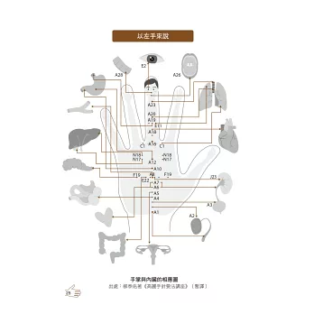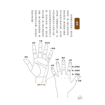 手掌、手背及每根手指皆與各人體內臟器有連結,身體感覺到苦痛時,雙手必定也會有所反應,該位置即為穴道,又稱穴位。掌握每一個穴位所連結的身體部位,平時沒事隨手按壓揉捏,即能健身健體、養顏美容、去病延年。