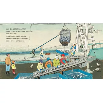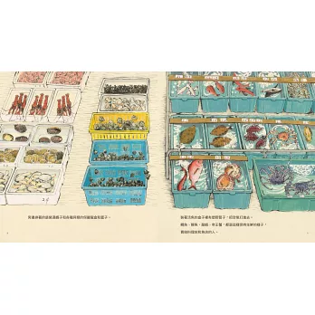 這本帶有「昭和」畫風的圖畫書給人一種古樸的感覺,一開始讀的時候不怎麼起眼,但是讀著讀著,居然有一種津津有味的感覺。透過書中小小女主角小清和爺爺的帶領,著實的從時間和空間兩個軸度來了解魚市場(漁獲拍賣市場)的運作。魚市場在空間上的分區錯落有致,魚類、蝦貝類和遠洋漁類等,大家各占一方。魚市場講求速度,海鮮漁獲最注重的就是新鮮,所以整個魚市場裡,從漁船到港卸貨、進入拍賣流程,這些都是在極迅速的狀況下完成;這群專業職人沒有一絲猶豫,因為時間就是金錢,因為新鮮就是金錢,越快把漁獲交給想要買的人是最最當務之急。魚市場每天都重複上演這樣緊張刺激的戲碼,怎能不叫人心動呢?先在家和孩子好好看看這本有趣的魚市場,有機會也帶孩子去看看魚市場吧!