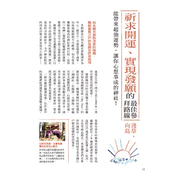 本書網羅「求開運、求財運、求姻緣、求事業、求學業」等大方向領域上「術有專精」的神社,規劃出主題式參拜路線。