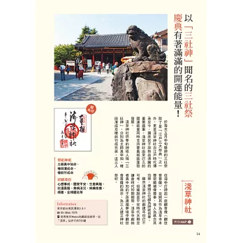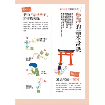 書中介紹的每個神社,除了神社外觀照和神社相關介紹外,還貼心附上地址、鄰近車站、從車站到神社的約略步行時間等資訊。