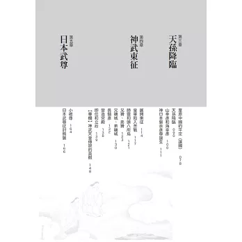 第四章『神武東征』內容為神日本磐余彥尊東征以及即位建國的經過,屬於《日本書紀》第三卷,相當於《古事記》中卷第一段,作者在該章最後提出若干觀點,特別針對「神武是否就是秦朝方士徐巿」提出自己的見解。第五章『日本武尊』介紹日本武尊一生的功業――包括征討熊襲、蝦夷。如果說神武東征的成就為建立日本國,那麼日本武尊征討蝦夷,將東國納入大和朝廷的版圖的功勳完全不輸神武天皇,屬於《日本書紀》第七卷,相當於《古事記》中卷第十一段。第六章『神功皇后』內容為神功皇后代夫平定熊襲,進而出兵朝鮮、建立任那日本府、平定覬覦皇位的其他皇子,以日本史上首位攝政之姿享有天皇實際權力。作者在第六章最後探討一些圍繞在神功皇后的問題,包括神功皇后是否該與歷代天皇並列的定位問題,以及她與中國史籍記載的卑彌呼是否為同一人,最後還概略提及珍藏於石上神宮的七支刀之謎。
