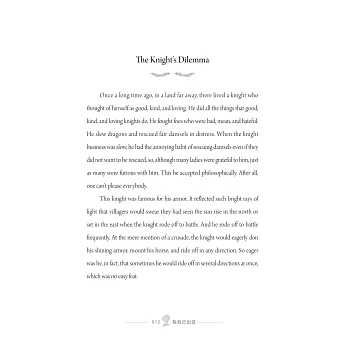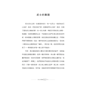 隨時隨地準備上馬比武、拯救受難公主的武士,正如你我,在繁忙人世、在日復一日的生活與工作裡,為了保護自己,穿上層層武裝的沉重盔甲。終於有一天,我們會和武士一樣,發現它竟然再也脫不下來了。