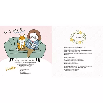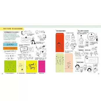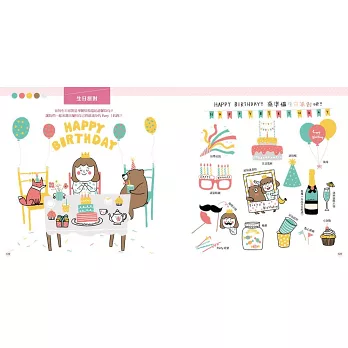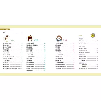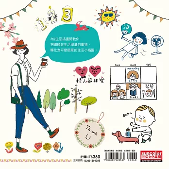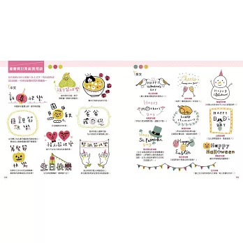 書中特別企劃插畫師的色彩運用、手帳紀錄、創意留言條、紙膠帶應用、標籤裝飾、穿搭美學、英文花體字、數字變變變、心情記錄……等,讓你盡情運用,創造屬於自己的特色。