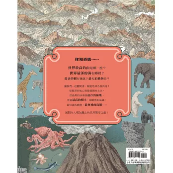 國際知名的臺灣新生代插畫家鄒駿昇,與設計感十足的英國繪本出版社Templar Company合作,以細膩、古典的畫風,以及充滿創意的版面設計,帶我們暢遊世界各個角落,探訪各式各樣的「世界之最」。從全世界最深的海底、最高的山峰,來到最炎熱的沙漠、最寒冷的極地,看盡最老的樹木、最大的動物、最耐熱的昆蟲、最快速的動物、最會飛的鳥類……呈現了我們所處世界的豐富與多樣。
