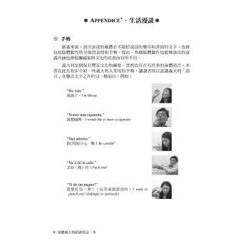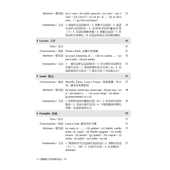 讀者尚可藉由配合課程主題的分類詞彙、以及介紹義大利旅遊生活需知的生活漫談等補充單元,自行創造練習時的變化、精進字彙,提升學習義大利語的興趣。