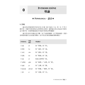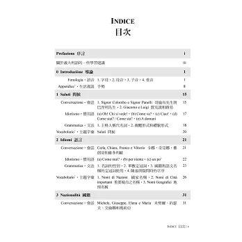 全書編有20項課程主題,透過日常情境的會話+短文、搭配實際常用的文法+慣用語,由淺入深、循序漸進,俾令讀者踏實並有效率地掌握義大利語的運用。