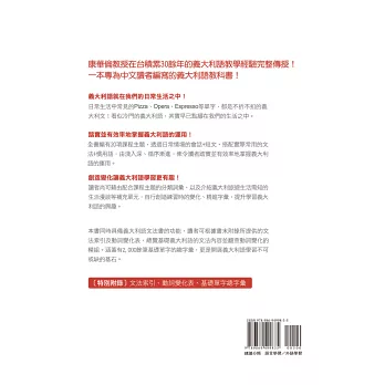本書同時具備義大利語文法書的功能,讀者可根據書末附錄所提供的文法索引及動詞變化表,總覽基礎義大利語的文法內容並翻查動詞變化的模組。涵蓋有2,000餘筆基礎單字的總字彙,更是開展義大利語學習不可或缺的基石。