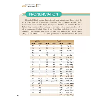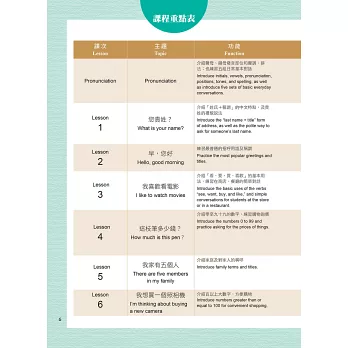 第一冊共十二課,教學目標是建構初學華語者聽、說、讀、寫所需的基礎能力,使其能成句表達與理解,達成日常生活中基本的溝通目的。本冊共有生詞 461 個,語法 49 則。
