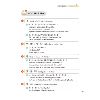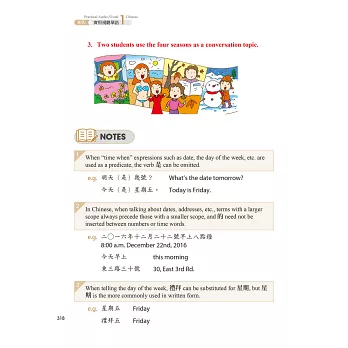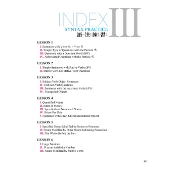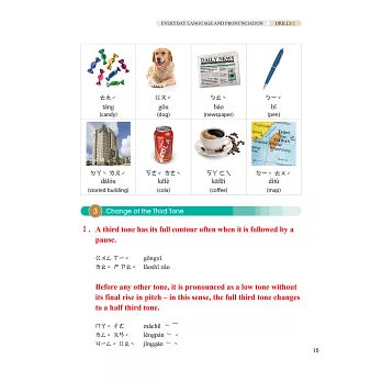 第三冊共十四課,教學目標是訓練中級學習者恰當地成段表達與理解的能力。本冊的課文內容環繞幾位學生在臺灣的日常及校園活動,讓學習者在擴展語言知識的同時,也能增強語境意識,掌握人物、場景等外在因素的影響。每課也提供不同形式之手寫短文,幫助學生熟悉漢字形體,並了解語體特徵。本冊共有生詞 559 個,語法 141 則。