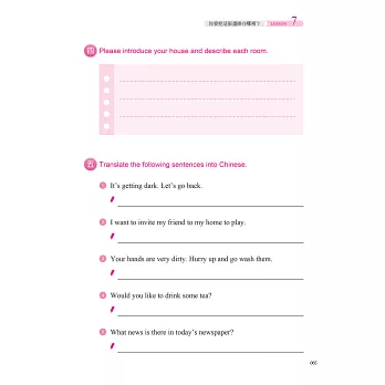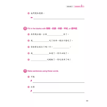 ◎本作業簿搭配教材分生字筆順學習及字音(包括音調)、字形(包括辨字、填空)、造句、重組、選擇、中譯等綜合練習,另有互動問答,以加強練習並了解學習成果。