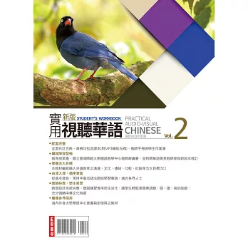 新版實用視聽華語共分(一) (二) (三) (四) (五)等五套,每套包含課本、教師手冊、學生作業簿、教學MP3等教材,由台灣教育部策畫,是目前最具權威性,最完整而實用的成人華語鉅著,受到台灣各華語中心及補習班喜愛並廣為採用,未來將陸續規劃出版電子書。