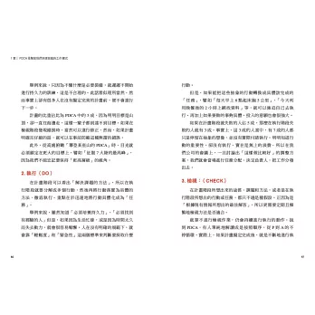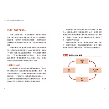 在內文會針對「鬼速PDCA」的所有重點做詳細解說,當中最重要的就是「檢視頻率」。PDCA 雖然是種工作循環,但並不是制式化按照P、D、C、A 的順序進行操作,而是在擬定計畫之後,反覆地解決過程中會出現的各種問題,持續著「可執行的循環」。