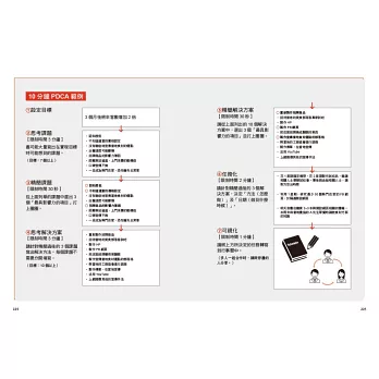 想要學習新東西,不能破碎化地記憶,而要掌握整體的知識架構,才能內化成自己的東西。好比想要理解台北市的交通路線,一定要先看地圖,體悟台北路網是個棋盤式結構,再針對主要幹道來記憶。如果只是照路名的筆畫順序去個別記憶每段路口,就算硬背起來,開車時也是搞不清楚東南西北。作者將PDCA細部拆解成一個從上到下,從粗到細的執行架構,建議讀者可以把它寫在便利貼上,貼在書本內頁,一邊閱讀一邊參照比較不容易「迷路」。我這裡也幫大家做個簡單整理: