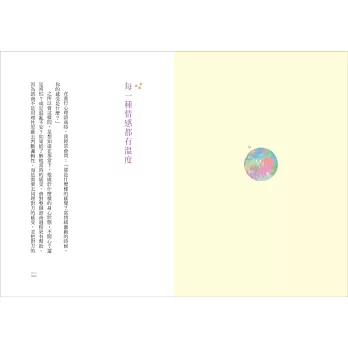 這一本《情感的溫度》,是以溫度來象徵每一個人內在情感的變化。例如:感覺到憤怒時身體會炙熱發燙、憂鬱的時候內心則會有熱情冷卻後的凍結,或是感受到幸福時,內心會感覺到溫暖。