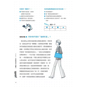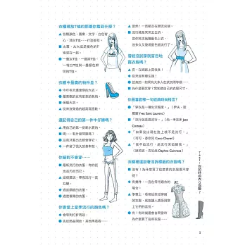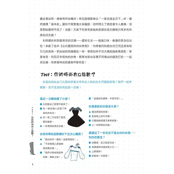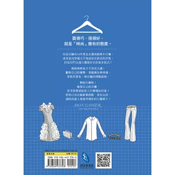 希望自己的穿著有品味,就像學騎腳踏車一樣,剛開始有可能會跌倒受傷,不過多試幾次就熟練了。但是現在多虧這本書的出現,你將不會再跌倒!衣櫥裡是不是有一堆穿過一次就冰起來的衣服?或者不小心買到很貴卻有過時感的洋裝?這本書將幫你輕鬆解決「搭配困難症」──新舊混搭、穿出自信!找到適合自己身材、能夠凸顯優點的款式和剪裁,巧妙搭配飾品、輕鬆變換風格……怎麼樣,看起來不賴吧!