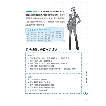 如果你總是穿著基本安全款、一套走天下,當然就不會知道白色襯衫是否比格子襯衫讓你看起來更為出色?也不會知道紅色可使氣色更好。穿搭其實是一場有趣的探險旅程,不要再害怕嘗試了,從現在開始,用最少最少的預算學習穿搭,絕對會有意想不到的收穫──天啊!居然時尚到連指甲都有型!
