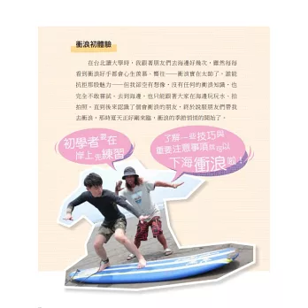 介紹時下年輕人喜歡玩的休閒活動,盧尚恩、郭柏傑、謝毅宏、紐士晨新生代藝人帶大家一起玩一起體驗,從入門開始帶讀者進入,如何找場地、怎麼玩的規則、需要的配備、活動的注意安全事項,一本在手衝浪、桌遊、漆彈、跑步全攻略玩法無窮。