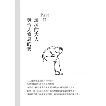 ————看著總是訴說委屈的父母,孩子會以體貼順從回頭照顧父母內心的缺憾。孩子逐漸長大後,有了不同想法、卻得不到父母支持時,會下意識地犧牲自我主張,以壓抑內心深處可能背叛父母的罪惡感。