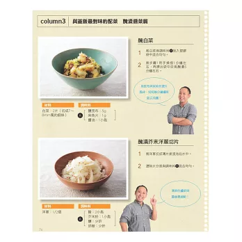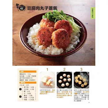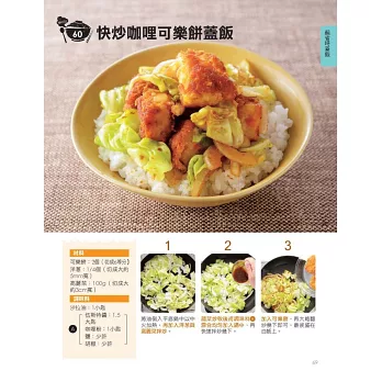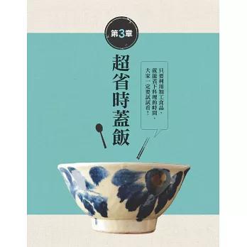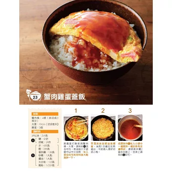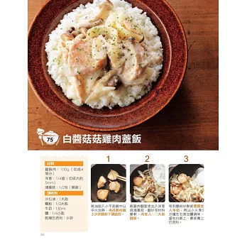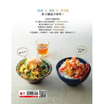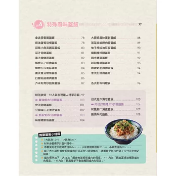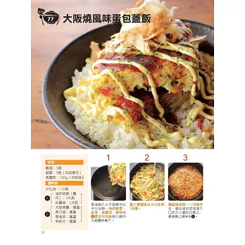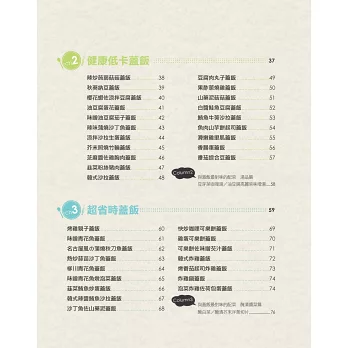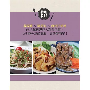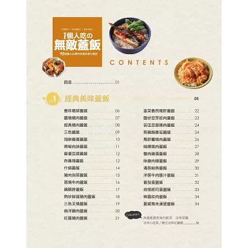 自己做出人氣店家風味的「經典美味蓋飯」、適合忙碌現代人的「超省時蓋飯」、營養好吃不發胖的「健康低卡蓋飯」、變化出不無聊的「特殊風味蓋飯」,不管是懶人、料理新手、忙碌上班族,讓你一開伙就上手!