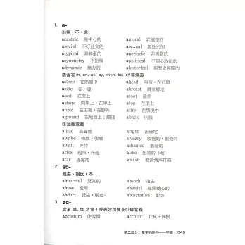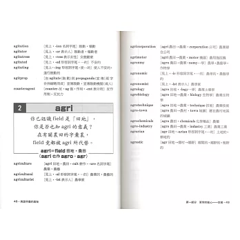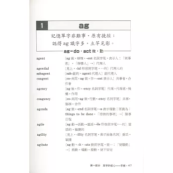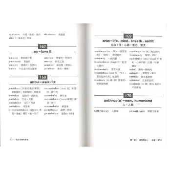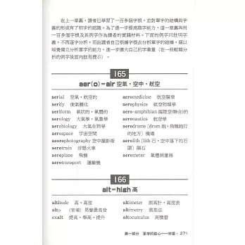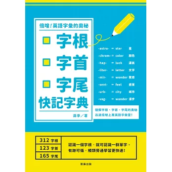後半部詳列常用的123個字首和165個字尾,並提供解釋與豐富例字,學習者一旦掌握字根、字首、字尾分析單字,即可快速記憶、辨識大量字彙提升字彙力。