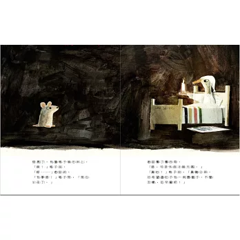 結果燈亮了,老鼠看見有隻鴨子躺在床上。這隻鴨子住在野狼的肚子裡,而且一點都不會想念外面,因為在野狼的肚子裡,就再也不必擔心被野狼吞掉啦!