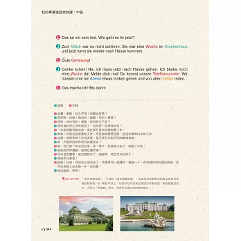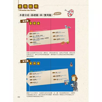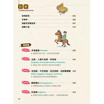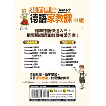 本書《我的專屬德語家教課:中級》內容以達到溝通交流為目的,將日常生活語句融入課程文章和對話之中,以便學習。課文的特色就是依據七個主題,設計出七個不同的章節,讓讀者可以身如其境般地體驗與融入德語系國家的生活與習慣。