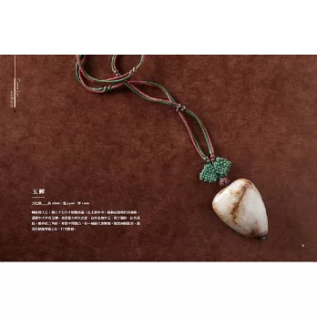 我以結配玉,做了七十多件。此次出書,特別要感謝獨立策展人曾學彥先生。他看見我配上結的玉飾,鼓勵我出書。玉是永恆之物,打結則是小技,能讓讀者分享我的樂趣,也是可喜之事。