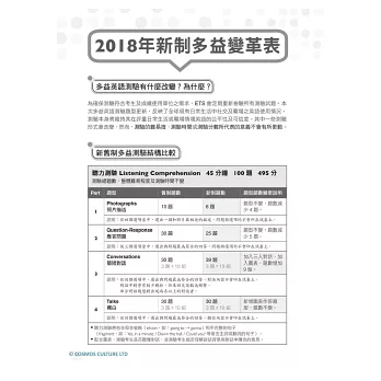 多益自2018年三月起改新制題型,閱讀總題數不變,但減少容易得分的Part 5句子填空,增加Part 6段落填空和Part 7單篇/多篇文章理解的題數及文章數。新制閱讀將即時通訊及網路論壇的文類納入題型,更新增需讀完三篇閱讀才能作答的題目,考驗考生對現代溝通方式的敏銳度及文章的整合能力和速度。本書的新型試題使用最新、最潮、最實用的詞彙用語,將精華全收在這1000黃金試題,讓讀者一手掌握改制新題型,走在時代尖端,成功奪得金色證書。
