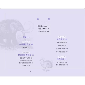 本書全面性介紹博物學家、思想家達爾文的生平與成就。從達爾文家庭生活開始,仔細描繪他養尊處優的童年時光,以及所受的教育。對於搭乘小獵犬號歷經五年航行,以及收集許多標本送回英國的事,都有非常生動精采的敘述。藉由把達爾文的觀點擺放在眾多哲學與科學思想家當中,作者同時也介紹了達爾文的前輩與同期名家的作品。除文字敘述外,本書也安排許多相關活動,包括建立分類系統、學會船員擅長的繩結,以及製作地質層。泛黃的早期照片與複製品重新打造了維多利亞時期的氣氛。附錄的延伸資料也提供學生繼續深入這個主題的助力。──《圖書館期刊》(安。喬斯林,伊利縣公共圖書館)
