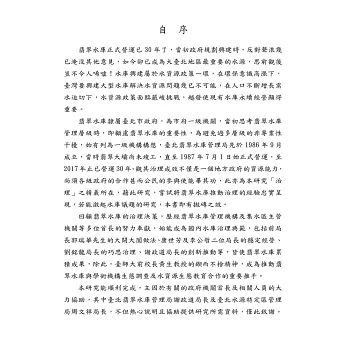 國內環保意識興起後,就再也沒有大型水庫的興建;即使進行規劃,最後亦無疾而終,包括:美濃水庫、坪林水庫等皆如此。既然新水庫興建已遇瓶頸,就須妥當維護原有水庫,始能擁有永續的水源。因之,舊有水庫的治理成功與否就顯得異常重要,此時探討水庫治理-「臺灣水庫治理:翡翠水庫的經驗」的著作完成,即甚具意義,它是結合理論與實務的重要著作,從公私協力、公民參與及跨域治理等角度,以探討分析翡翠水庫之治理作業,並以「生態」、「水土保持」、「水源維護」、「環境景觀」、「教育宣導」及「亢旱」等六大業務類型,以為分析構面。以治理的性質言之,已可涵蓋國內水庫的主要治理面向。由於作者長期於翡翠水庫任職,對水庫業務甚為熟稔,書中見解頗稱深入,可供有司者推動業務之參考;尤其於北臺灣最大亢旱期間,渠兼任臺北翡翠水庫管理局新聞聯繫及發言人職務,得以參與決策的擬定,對事件始末更能精準詮釋和提出諸多發人深省之看法。