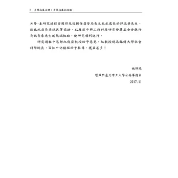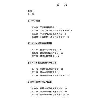 該著作主要以水庫治理為研究主軸,為國內首部以多層治理構面,有系統探討水庫的治理問題。從資料來源觀之,相關公部門首長從意見到資料的提供協助甚多,這是本著作除具學術研究價值外,亦極具實務參考之處,著有嘉許者在此。