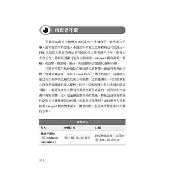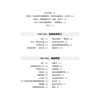 1.廣泛收錄常見的眼睛狀況與疾病,不論是現代通病3C眼、近視眼,還是老年容易罹患的老年環、白內障,又或是遭受意外引發的視網膜剝離、青光眼等,全都包含在內。