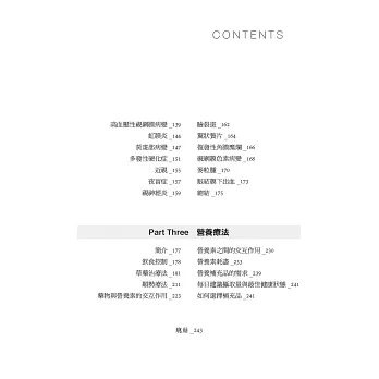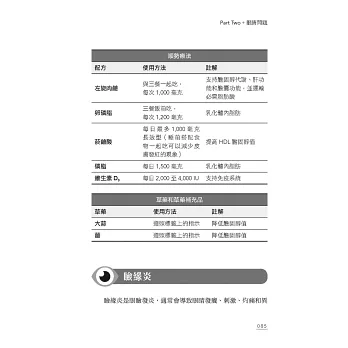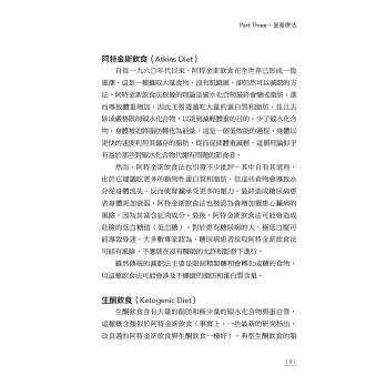 3.整合各種飲食與營養療法,如阿特金斯飲食、生酮飲食、地中海飲食與順勢療法等,幫助你找出專屬於自己的生活型態,並瞭解該如何選擇適當的保健品與用量。