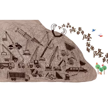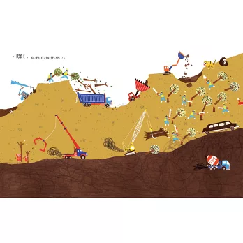 很久很久以前,有一座山,一天,山下來了許多人,無視於眼前的山和山上的小動物對他們親切問好,只是逕自對著山量來量去。「轟隆轟隆轟隆——」,卡車、挖土機、鏟土機、混凝土拌合車……各式各樣的工程車,就這樣開進了山裡,砍掉樹木、挖掉山坡,「咚咚鏘鏘」的蓋起了房子、工廠,把原本平靜的山變成吵雜的工地,小動物們紛紛搬離家園,山再也忍無可忍……