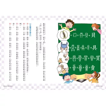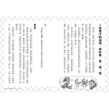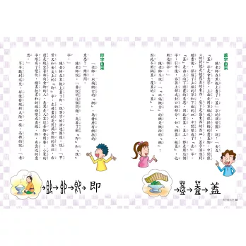 另外,這本書的書寫是透過師生問答的方式呈現,顯得更為活潑有趣;大量的歸類說明與舉例,讓小朋友不但能聽到字的故事,也能從故事當中認識每一個字的來源,寫錯字的機率自然能避免;更有趣的是,課程也對於平常生活會使用錯誤,或者被誤用的字,或者容易混淆的字詞做出歸類與解釋,讓死板的文字學跟生活做結合後,變得更為實用。