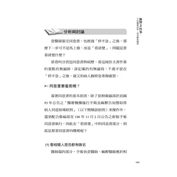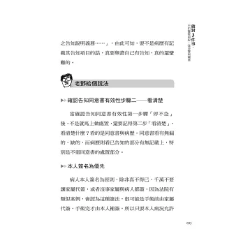 全書分為三大篇:告知、病歷、錄音,共30章。每章體例統一,第一段落是醫療糾紛「案例」的敘述,均為真實發生的事件;第二段落是「分析與討論」,說明案例的爭點與問題所在,以及醫療法律的相關規定、法官判決的理由等;第三段落「老鄧給個說法」則是鄧醫師提出的具體建議,遇到相關情況時,醫師該如何準備與應對,掌握有效方法,預防類似糾紛的發生。