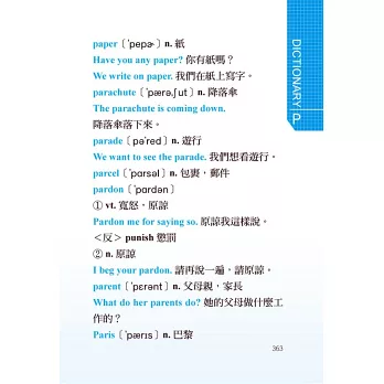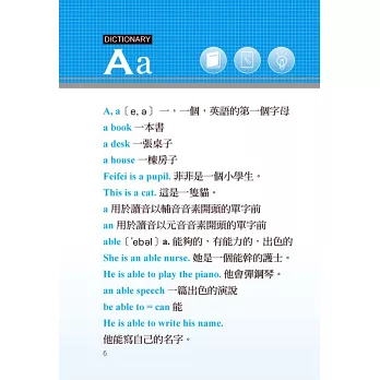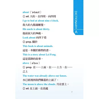 本字典是國小國中學生必備的字典,依照教育部公布的常用英文,配合九年一貫英語課程,完全收錄基礎單字、常用定義,每個單字都有音標、詞性、中文解釋,以及精心編製的日常生活實用例句,讓您學習教材時不再與生活格格不入,而是實際與生活融入一起,加強整體英語實戰能力。
