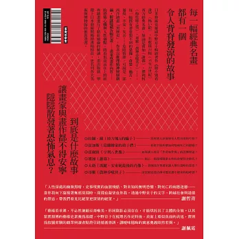 「經典藝術之所以動人,在於藝術家能洞悉人性幽微,透過精心鋪陳的藝術創作直指人心。這樣的洞見,往往隱匿在細節與背景。好比微言大義,魯鈍的凡夫俗子難以全然掌握,難免漏失誤讀。藝術若求真,不必然兼顧至善唯美,形同陰影必須存在,才能烘托出了主體的全貌。以其紮實淵博的藝術史素養為基礎,中野京子在梳理名作史料後,表面上看似負面的表述,實則為按圖索驥的觀眾與讀者點燈引路循循善誘,讓曖昧隱晦的寓意奧義昭然若揭。」————謝佩霓(策展人、藝評家)