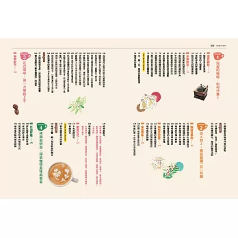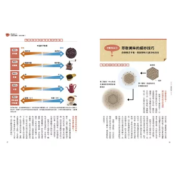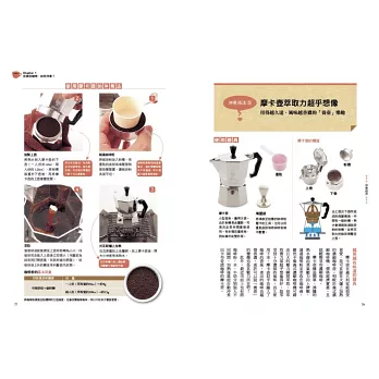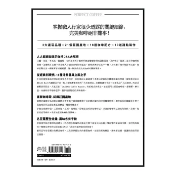 大量彩色照片及科學圖表,輔以專業清楚的圖文編排,由咖啡名店與職人行家親自示範,解說關於咖啡知識與關鍵訣竅。