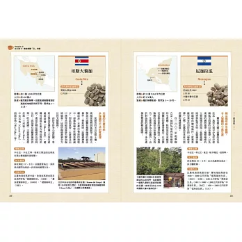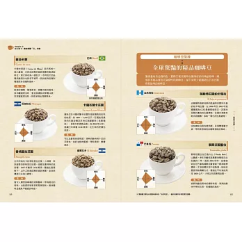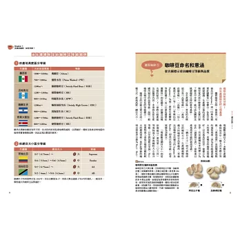 此外,更介紹世界三大洲知名但價格較實惠的頂級咖啡豆,如巴西聖多斯、夏威夷可娜、亞買加藍山等等,清楚呈現產地概況、風味雷達圖、建議烘焙度等原豆履歷,是咖啡愛好者不可錯過的選豆指南。