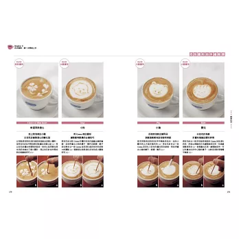 ◆咖啡拉花的成功祕訣不藏私,從萃取濃縮咖啡、製作綿密奶泡,到使用拉花杯注入奶泡、利用拉花針繪製圖案,掌握細節就能輕鬆上手。