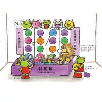 2.幽默感:小狗賣的熱狗是狗肉做的嗎?愛推糞的糞金龜推的圓滾滾地瓜球你敢吃嗎?企鵝賣的霜淇淋竟然是花枝口味?……最天馬行空的想像,最童心可愛的發問,跟著愛吃&愛發問的青蛙兄弟一起去逛園遊會吧!