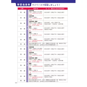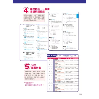 本書附贈每日學習進度表及考前關鍵進度表,只要你每天預留30分鐘練習18題,固定做一點學一點,按表操課,便能日積月累,30天就能見效,原來N1合格也可以這麼簡單。