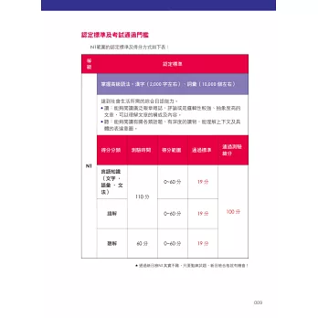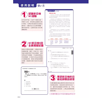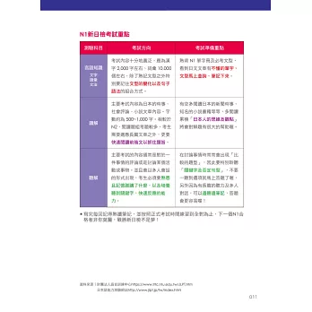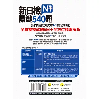 你不是考不過,只是不了解新日檢!想要N1合格,那就要從認識新日檢N1開始,在開始寫試題前先清楚試題內容、分數判定方式及應考關鍵,讓你自我評估,以便於更快進入新日檢應戰狀態,新日檢合格有秘密。