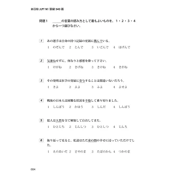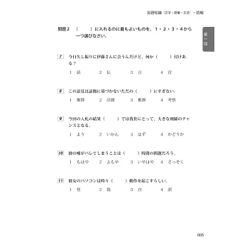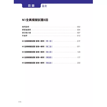 5回新日檢N1全真模擬試題皆仿照日本語能力測驗(JLPT)規格,包含題數、範例題、出題方向及難易度……等,臨摹考場的考試流程,平時練習就能具有臨場感,正式上場不緊張。