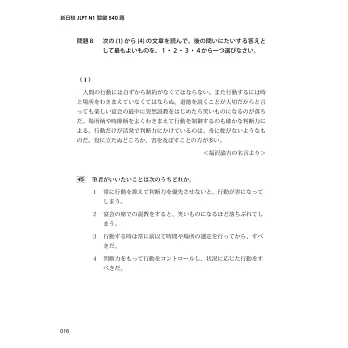 N1的文章都偏長,若沒有常練習,突然看到大篇幅的文章可能會非常頭痛,所以配合著模擬試題,先看題目再回頭找答案,抓住關鍵字,不用讀完整篇文章也可以知道答案。此外平時更要多看、多讀,利用時間多看日本新聞網站、報章雜誌或長篇文章,從生活中培養閱讀能力,以提升日文閱讀速度。