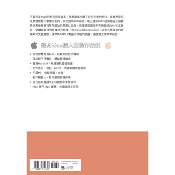 不管你是MAC的新手或是老手,蘋果電腦中藏了許多方便的密技,是我們從來沒發現或是不常使用到的,白天使用WIN系統,晚上使用MAC,經營超過三個蘋果玩家粉絲團和專業網站的蘋果仁站長,首度精選讓效率突飛猛進的Mac工作術,從檔案管理到各種桌面程式切換,從iCloud到Automater,從照片修圖到PDF編輯,讓你的APPLE電腦不只輕巧美觀,更能讓工作效率加倍!